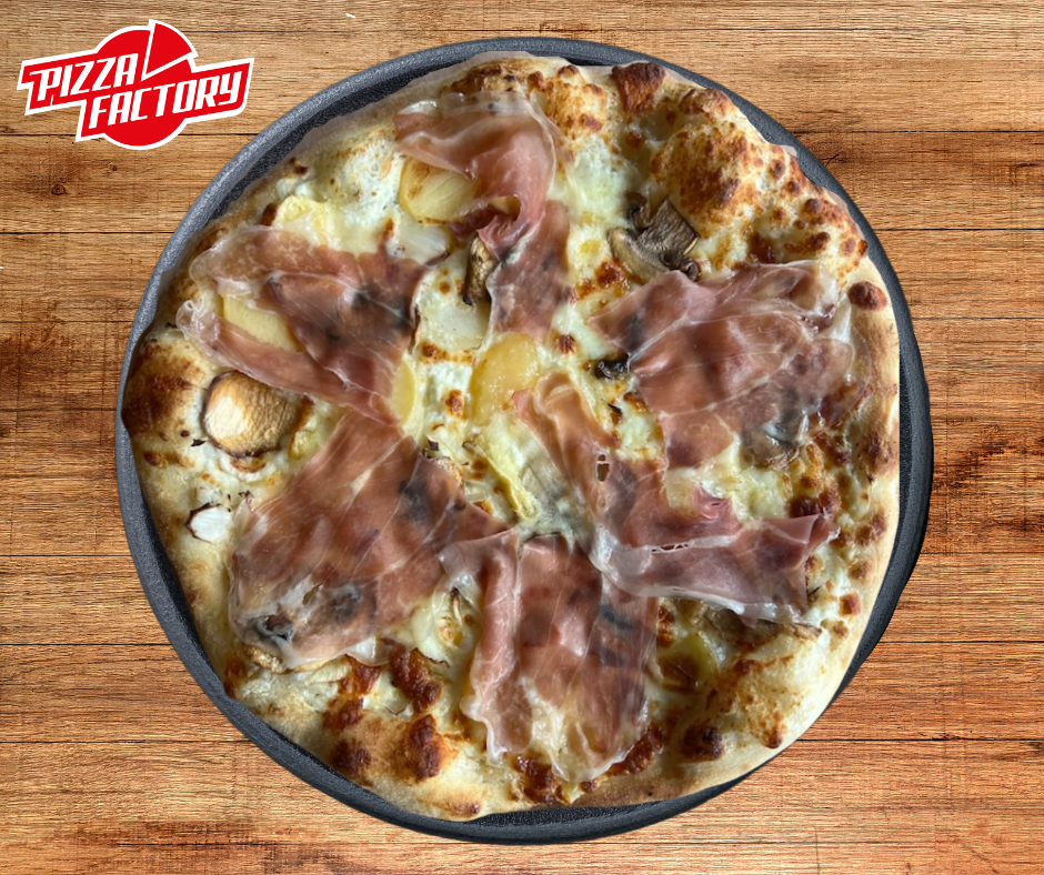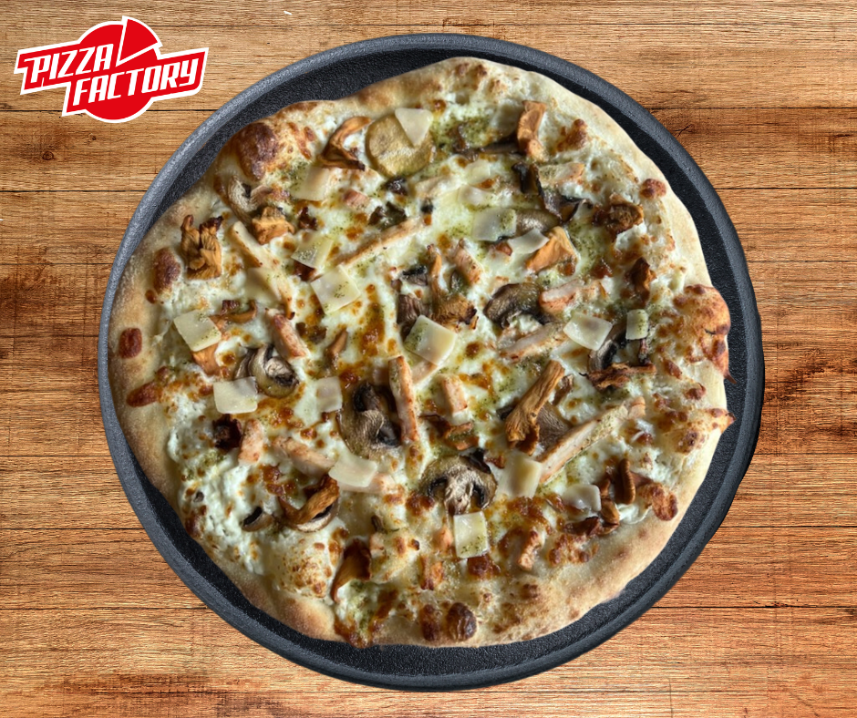 Sauce tomate, mozzarella, grana padano, poulet, tomate cerise, pesto